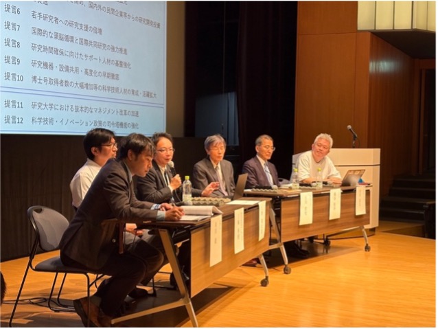 トップ10%論文比率の低下などの指標に加え、「選択と集中」の過度な進行、有期雇用の常態化、博士課程進学者の減少、いわゆる“研究氷河期”世代の静かな離脱が重なり、研究を支える「人」の基盤が揺らいでいる ─この危機感を出発点に、制度改革と政策支援のあり方を「政・官・学・民」の対話の場として位置づけ、現場の声を政策や制度に反映させること、研究の中心的役割を果たす大学の未来像、さらに策定が進む「第7期科学技術・イノベーション基本計画」に焦点を絞り、シンポジウムを展開しました。