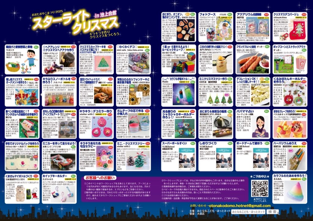 スターライトクリスマス2025in池上会館というイベントで、昨年に続き2回目(夏のイベントを合わせると3回目)の出展でした。東京都大田区でこども食堂やこども向けイベントを運営している、おとな&こども・ほっとネットさん主催で、こども達が自分の意思で楽しむことをとても大切にされています。
