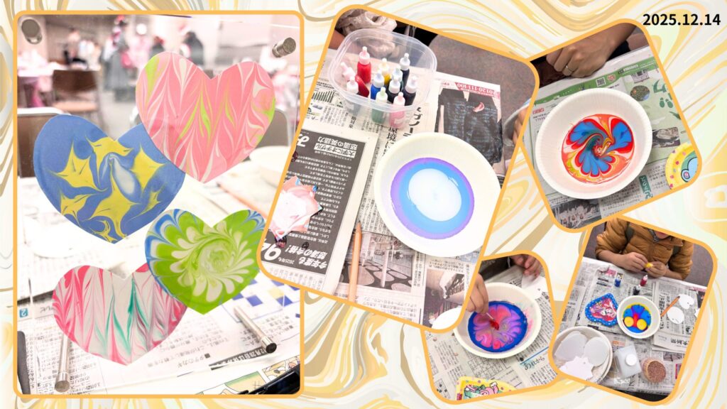 今回、JAASで用意したのは、表面張力を体感できる「マーブリング」です。クリスマスシーズンという事で、厚紙にうつしとり、オーナメントになるように作りました。水溶液の動きを観察して、繊細に模様を描く子もいれば、お構いなしにグルグルとかき混ぜる子もいました。また、思いがけず素敵な柄が出来上がったり、思うようにいかない場合があったり、しずくの落とし方で、絵の具が浮いたり、沈んだり、違ってくるのも面白がる姿がありました。どうやったら見本のようにきれいにできるか試行錯誤するなど、夢中になってくれていました。